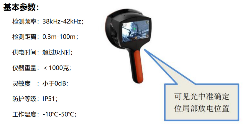 集成了124个声波传感器,可通过超声波阵列对局部放电进行定位和成像。广泛应 用于电力设备的电晕放电、悬浮放电、表面放电、机械振动等的状态检测,手持式的结 构,方便轻巧,可实现带电状态下的非接触式检测,在常规的巡检中,查出设备的潜在 隐患。